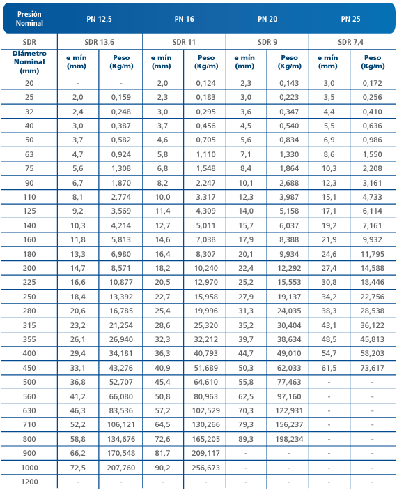 Diámetro de la tubería (DN): el diámetro nominal de tabla corresponde siempre a diámetro externo.