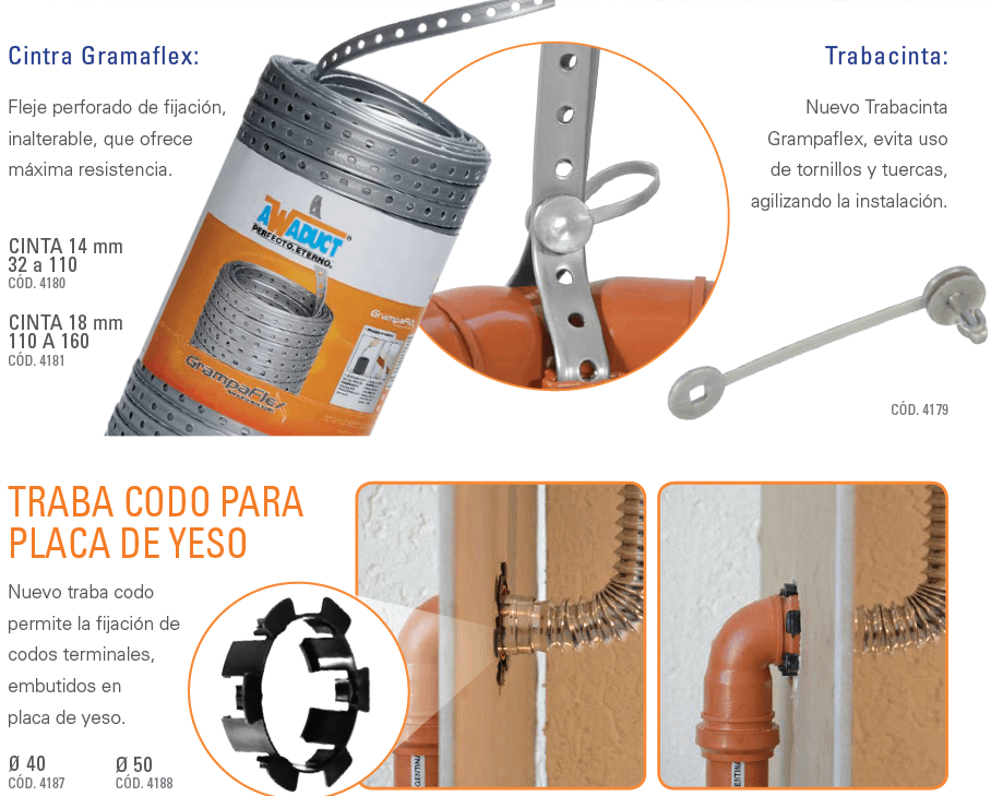 - Únicos accesorios con anclaje para fijación de instalaciones suspendidas con fleje perforado, varilla estándar y la exclusiva cinta Grampaflex