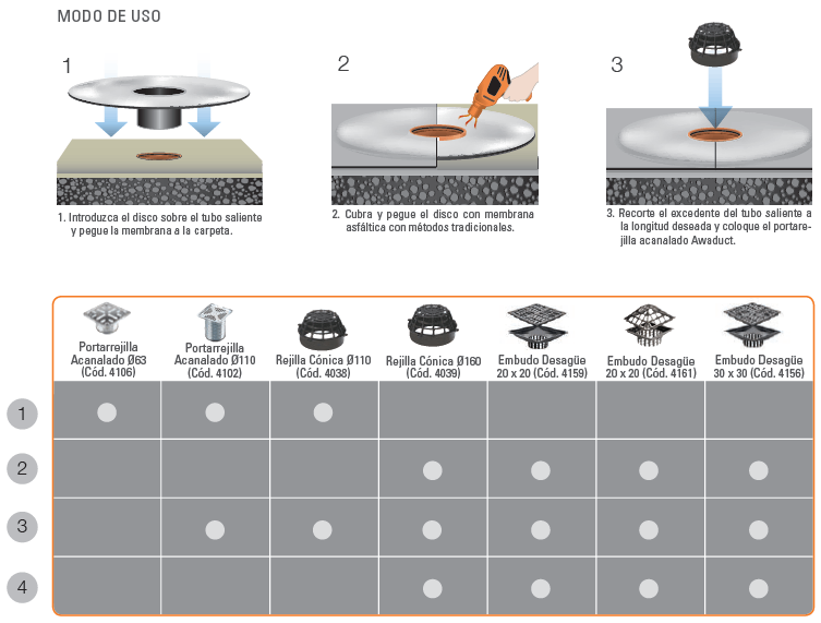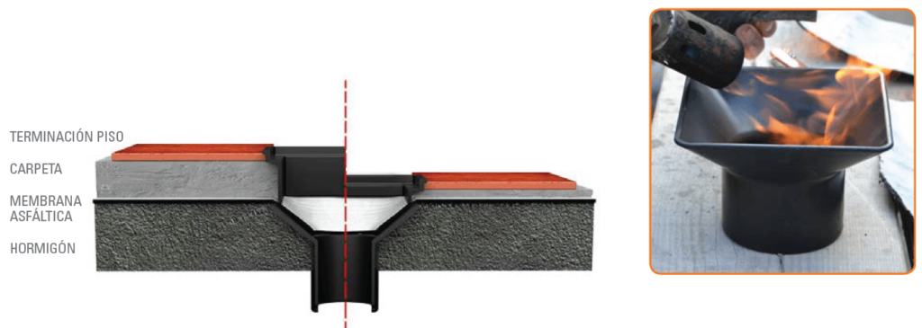 El nuevo Embudo con Marco y Rejilla de 20×20 con Salida 110 posibilita la adherencia de membranas asfálticas a través del método tradicional de llama directa (soplete). Su compuesto de materia prima (Acustik) clasifica como clase B2, de acuerdo a los requisitos de la norma DIN 4102:1998 (INTI OT 101/25611-JULIO 2015). El embudo con Marco y Rejilla es compatible con sistema Awaduct y Acustik.