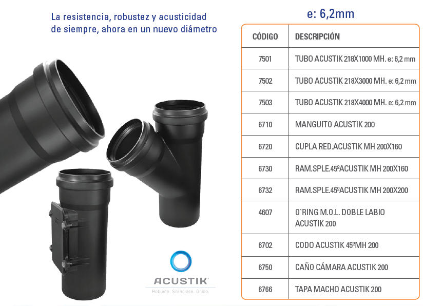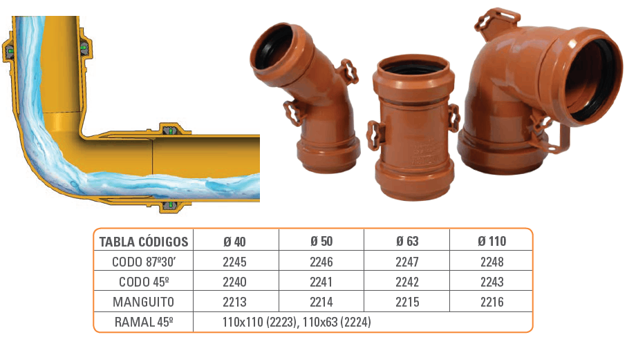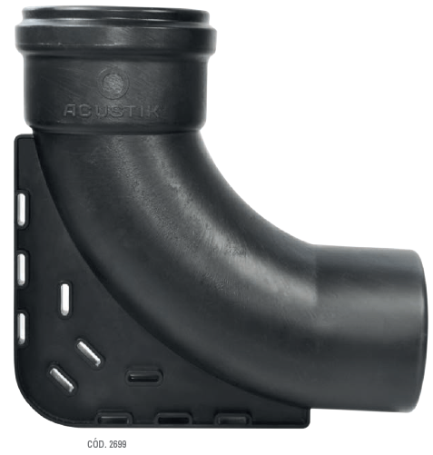 ACUSTIK amplía su línea de accesorios con esta novedosa Curva 87º 30’ MH de diámetro 110 con sujeción y base. A través de sus hendijas facilita el pasaje de la cinta perforada, asegurando su fijación.