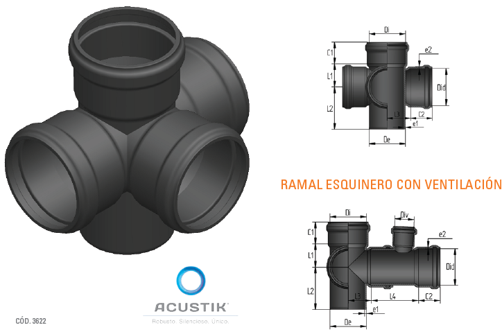El nuevo ramal esquinero Acustik, se presenta con su boca central abierta y sus dos bocas laterales cerradas. Esta cualidad permite convertirlo en ramal a ventilación acoplando un ramal simple Acustik