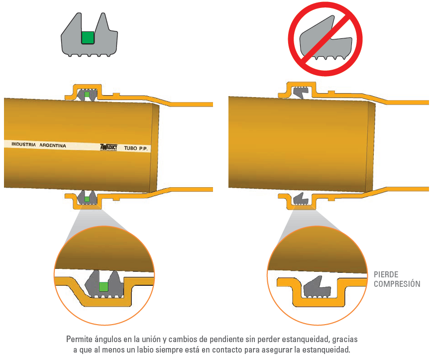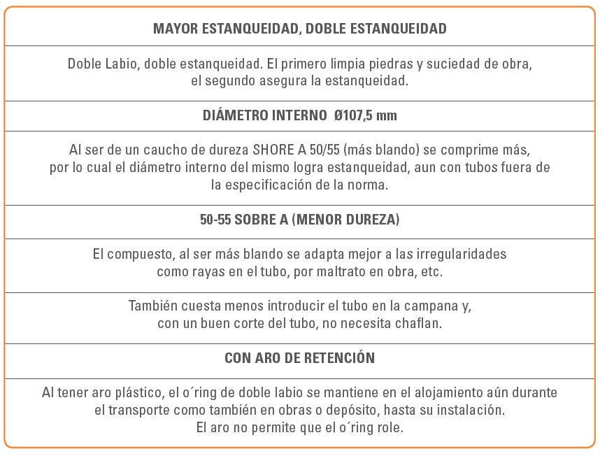 El aumento de dureza SHORE A del O´ring de doble labio afecta su adaptabilidad a las deformaciones o ralladuras de la superficie de la campana y tubos, es decir, perjudica la estanqueidad.