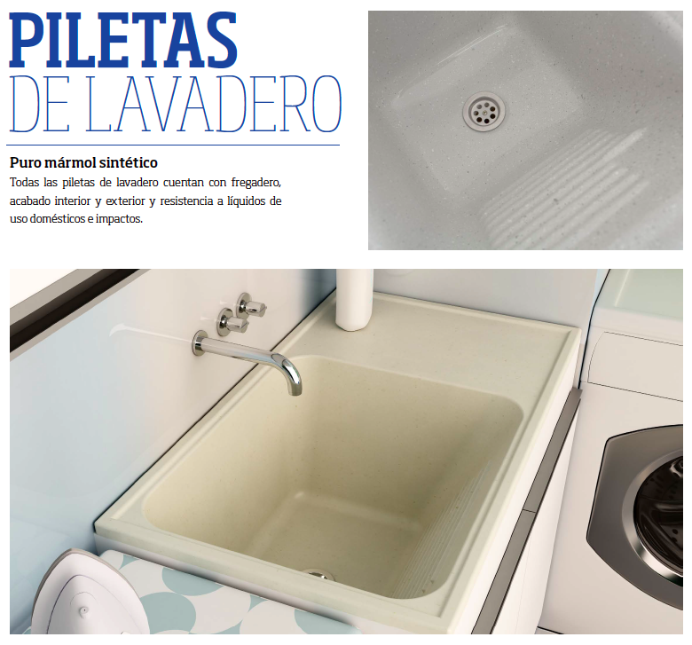 La bacha y la mesada formando una sola pieza, lo que evita derrame y filtraciones. Su precio es muy inferior y más conveniente en la relación calidad y precio respecto al mármol natural.