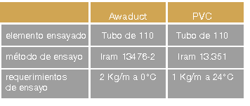 El sistema Awaduct está dimensionado de acuerdo a la norma IRAM 13476-1 -dimensiones- y cumple sobradamente con los requerimientos de impacto, estabilidad dimensional y presión interna de la norma IRAM 13476-2 -ensayos-.