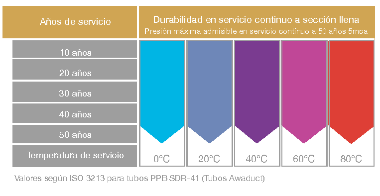 En presencia de altas temperaturas y sustancias corrosivas no se degrada, por ello supera largamente los requerimientos de vida útil de la totalidad de las instalaciones domiciliarias y de la mayoría de las instalaciones industriales.