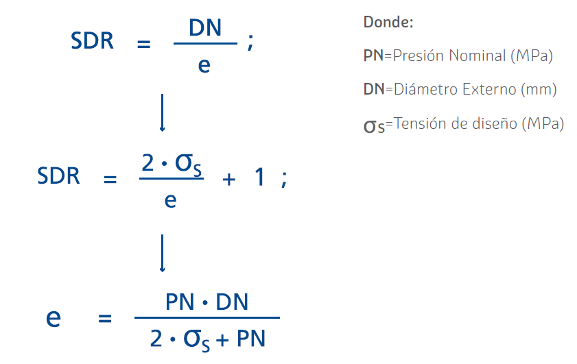 (Standard Dimensional Ratio). Es un valor adimensional que relaciona el diámetro externo nominal (DN) y el espesor de pared de la tubería (e). El SDR está estandarizado en valores y representa una presión nominal. Se tienen las siguientes ecuaciones: